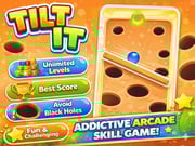 Tilt It is a challenging arcade-style skill game inspired by classic bar balance mechanics. You control a horizontal stick with a ball resting on it and must carefully tilt the stick left and right to guide the ball upward toward the final green goal hole. Endless skill-based arcade mode, high-score challenge, dynamic obstacle patterns, and increasing speed and difficulty. Smooth physics, simple and responsive gameplay, sound on/off, pause and restart. Perfect for reflex-based skill games and high-score fans. If the ball falls into any black hole, you're out—reach the green hole at the top to complete the level!